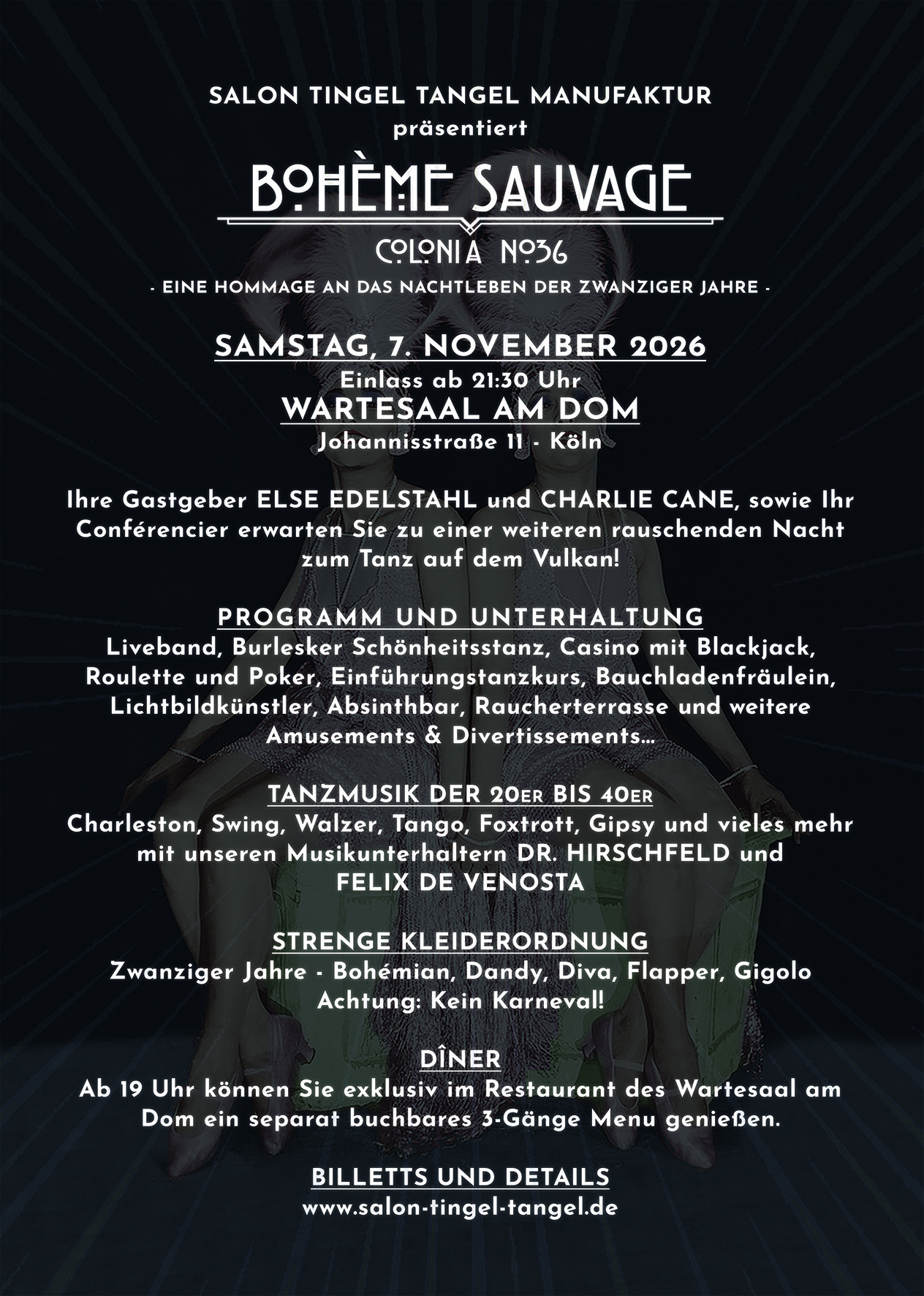 Im Chic der Zwanziger Jahre, einem Hauch von Fin de Siècle Melancholie, im Zwielicht dubioser Geschäfte und zwischen Varietègirls und Dandys lässt sich für den Bohèmian und Seinesgleichen die Nacht genießen. Auch mit etwaigen Mafiosis und anderen Gaunern können Sie an diesem Abend per Du sein, denn Sie haben nicht viel zu verlieren – außer Ihre inflationären Reichsmark.